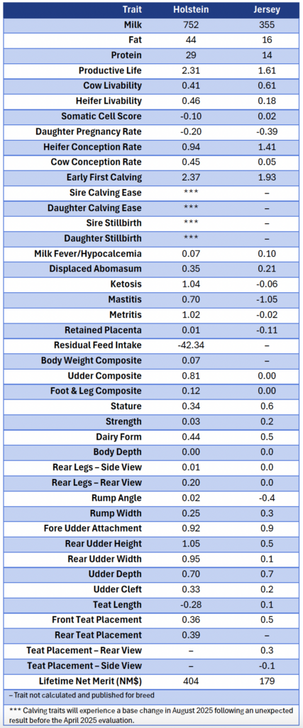 It should be noted that the calving trait base change will not take place until August 2025 because of unexpected results leading up to April 2025 proofs. That means that the genetic base and expected proof values for Sire Calving Ease, Daughter Calving Ease, Sire Stillbirth, and Daughter Stillbirth will remain unchanged until this update in August.
